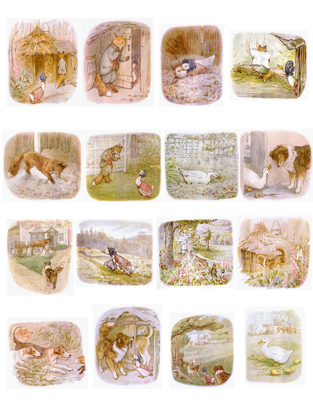 Do you remember the miniature books with all of the Tales by Beatrix Potter? I was enthralled with them when I was little. I loved the stories but I was really drawn in by the illustrations. It was though I was taken to the English countryside and plopped down amongst Peter and his friends. I found some online library copies of these booklets. I have included the link to the Gutenberg Library book of The Tale of Jemima Puddleduck. In addition, you can download the PDF version of the images from the story, or save pages 1 and 2 to your computer, and edit and print them to make your crafts, anything from bookmarks and tags to banners. Take a trip down memory lane with Jemima Puddleduck and Mr. Todd! I hope you enjoy these lovely illustrations and will use them for projects that inspire and make you happy.