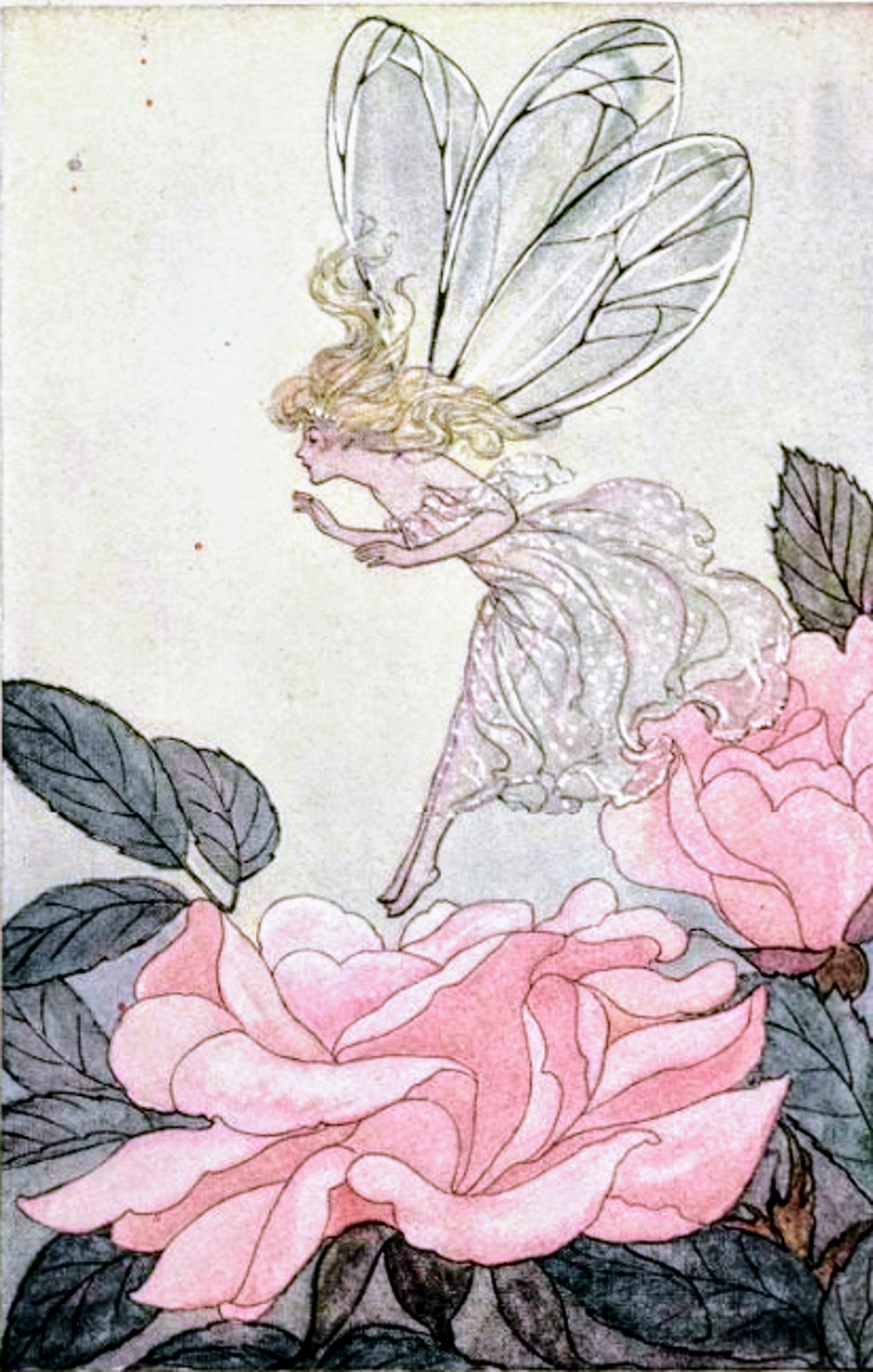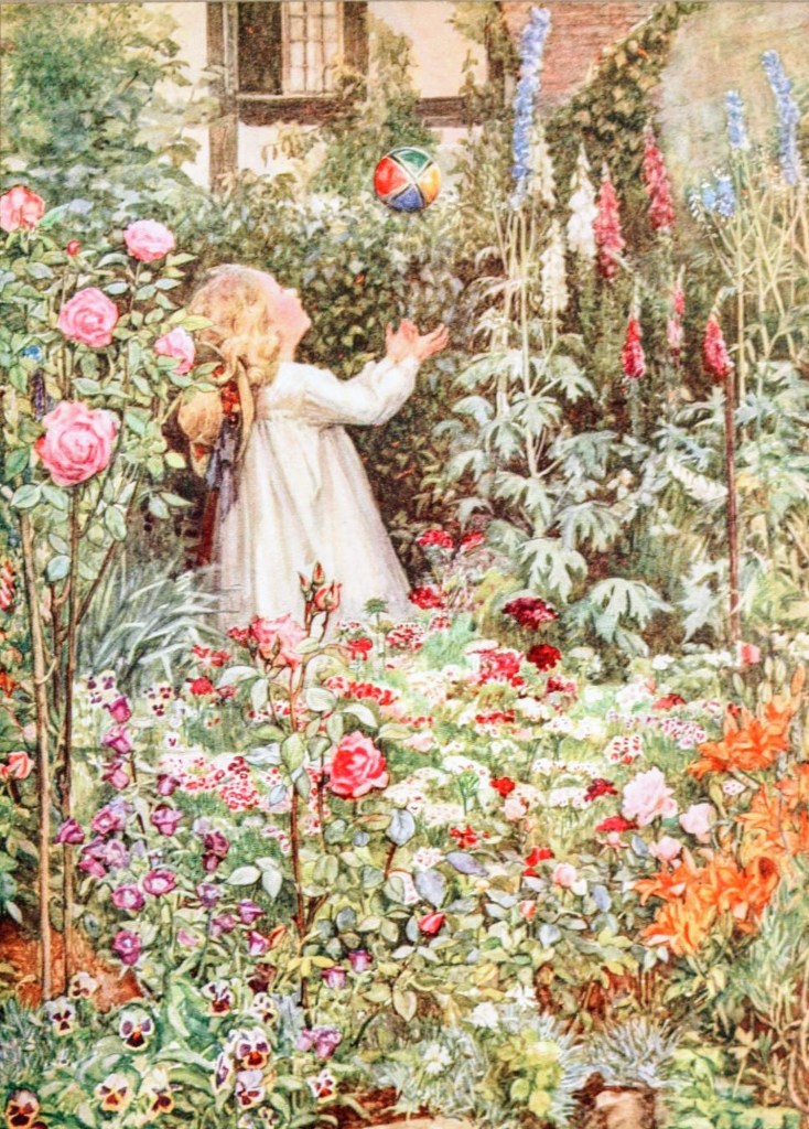 So today I am sharing two pictures by Elenore Plaisted Abbott from the Flower Maiden and Other stories by Hans Christian Andersen published in 1922. The first is titled “Tiny Flew From Flower to Flower”. I just love the soft pink hues and gossamer wings of this fairy. The second is called “The Prince Drew Back the Branches” and is reminiscent of Sleeping Beauty, however, it comes from the story The Garden of Paradise. Here is a brief excerpt ,”Then he drew back the branches. There she lay asleep already, beautiful as only the Fairy in the Garden of Paradise can be. She smiled in her dreams; he bent over her and saw the tears welling up under her eyelashes. “ Do you weep for me? ” he whispered. “ Weep not, beautiful maiden. I only now understand the full bliss of Paradise”. The third picture is illustrated by Etheldreda Gray and is found in The Treasure Book of Children’s Verse from 1911 and makes me think of my garden outside and my children playing and laughing on a lovely spring day.