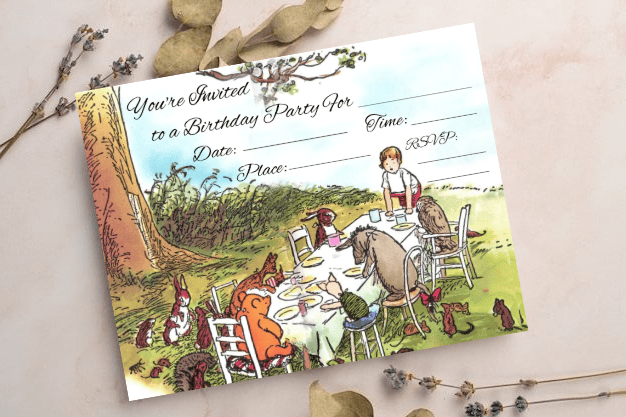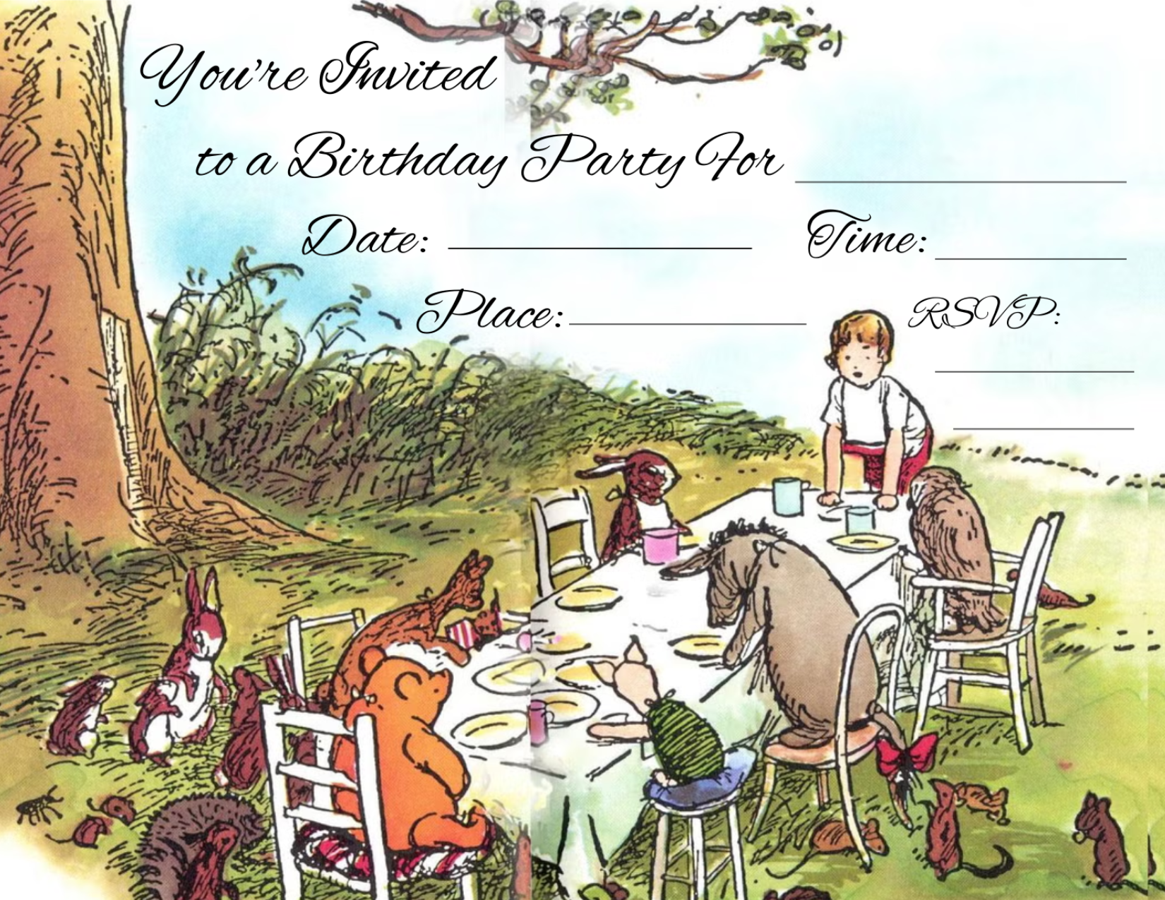 As I mentioned in my previous post the first two Winnie the Pooh books illustrated by E.H. Shepard are in the Public Domain now, so you can use this card as the image is taken from there. I hope it gives you joy to sit and write all the details by hand, maybe even enlisting the help of the birthday child to draw a picture on the back. It can become a fun activity that helps build the anticipation for the big day. Have fun and enjoy your party!
