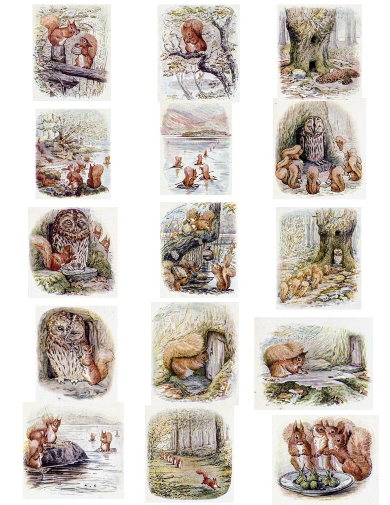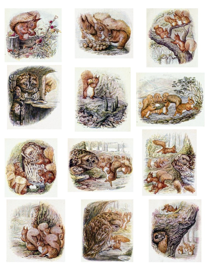In the Tale of Squirrel Nutkin, the mischievous Squirrel Nutkin teases an owl named Old Brown by repeatedly asking him riddles which Old Brown has no interest in answering. Eventually, Old Brown becomes so angry with Squirrel Nutkin that the squirrel is lucky to escape with his life and does lose his tail in the incident. Throughout the book, Squirrel Nutkin shows a lack of respect towards other animals, especially the old owl. This lack of respect causes him to face consequences for his actions. One of the morals of the story is for children to understand the importance of treating others with kindness and respect. I especially like this story because of my experience with my own twin boys who incite each other into mischief, sometimes it feels like all day long. It is a wonderful way to get them laughing about Nutkin’s mischief while also emphasizing to them the importance of respecting others. Of course, the illustrations are so beautifully rendered and have been memorable to me from the time I read this book as a child. I invite you to indulge in a bit of nostalgia as you join Squirrel Nutkin and Old Brown in their troublesome adventure. I have included the link to the Gutenberg Library book of The Tale of Squirrel Nutkin. In addition, as these are in the Public Domain, you can download the PDF version of the images from the story, or save pages 1 and 2 to your computer, and edit and print them to make your crafts, anything from bookmarks and tags to banners. I hope you enjoy these beautiful illustrations and will use them for projects that bring you joy.