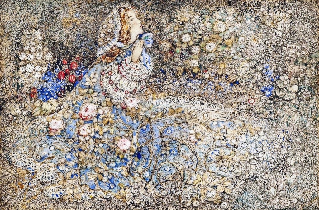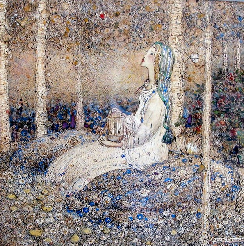 In the gallery of her work I have included in this post, you will see the detailed lines, dots, delicate palette and decorative work. To me, they are altogether lovely, soft and enchanting. They draw me into mystical landscapes with dreamlike figures, often so hauntingly beautiful. I hope you will enjoy her imagery.