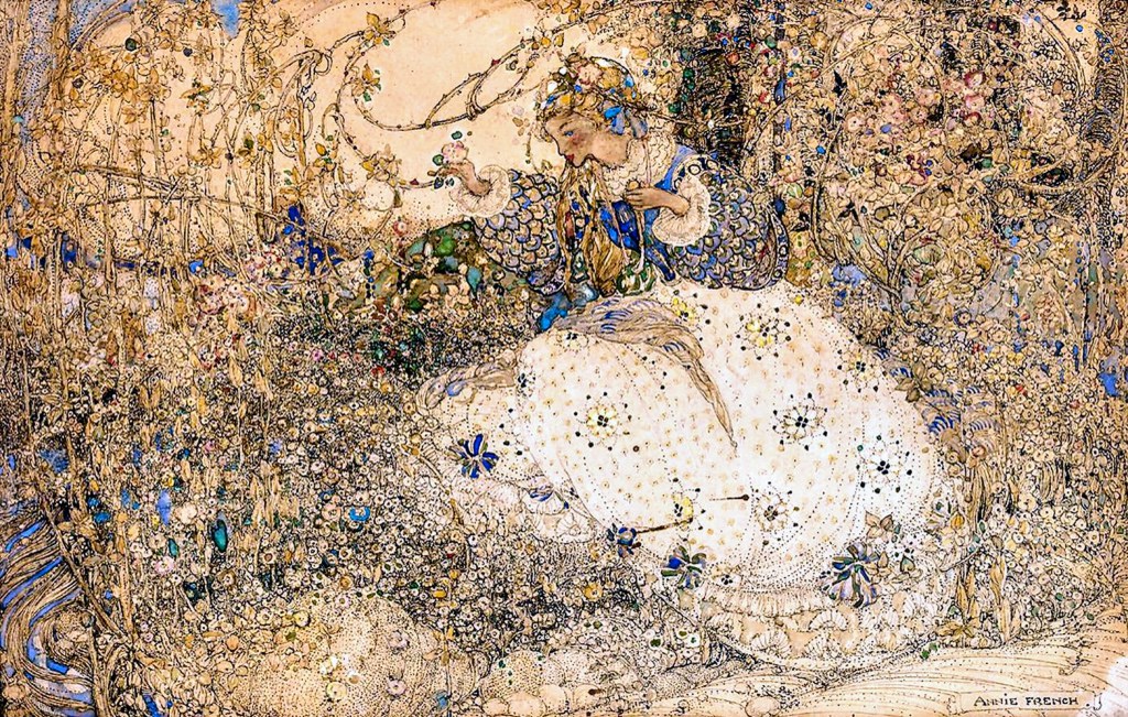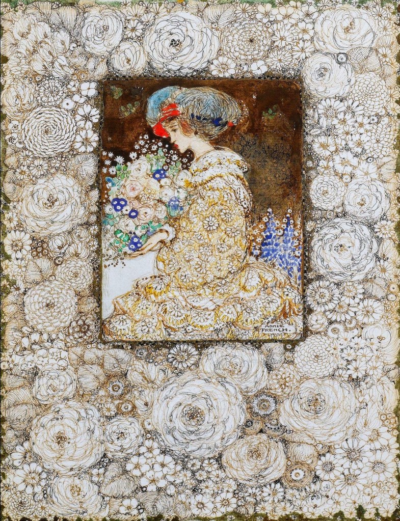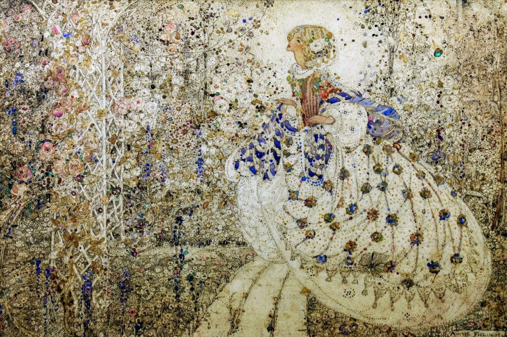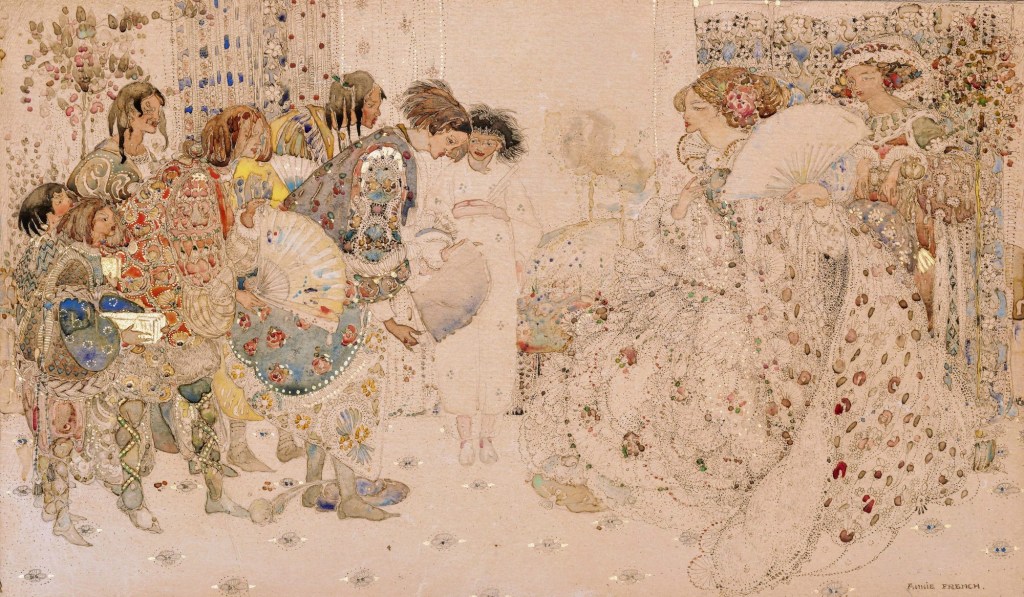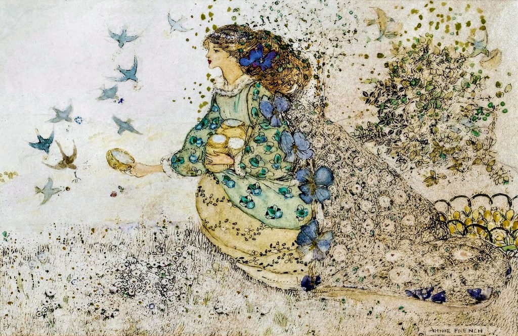 As part of the Art Nouveau artistic movement, Annie excelled at the delicate, intricate patterns and organic motifs favored by her Scottish peers. As one modern scholar has noted, ‘Her backgrounds are extremely detailed, full of flowers, green swards, plants, trees. Mechanisms and industry do not appear. There is considerable variation in tone, which is achieved by fine and finer pen lines, dots and dotted lines, hatching. The darkest patches are usually complex hatching, not plain solid black. It is a style requiring time, patience, and considerable invention. Where colour is used it is generally applied decoratively, with an eye to pattern. The work is a line drawing with colour, not a watercolour with lines, although sometimes lines are used over the colour again. Very often the base of the work is a brown paper.’