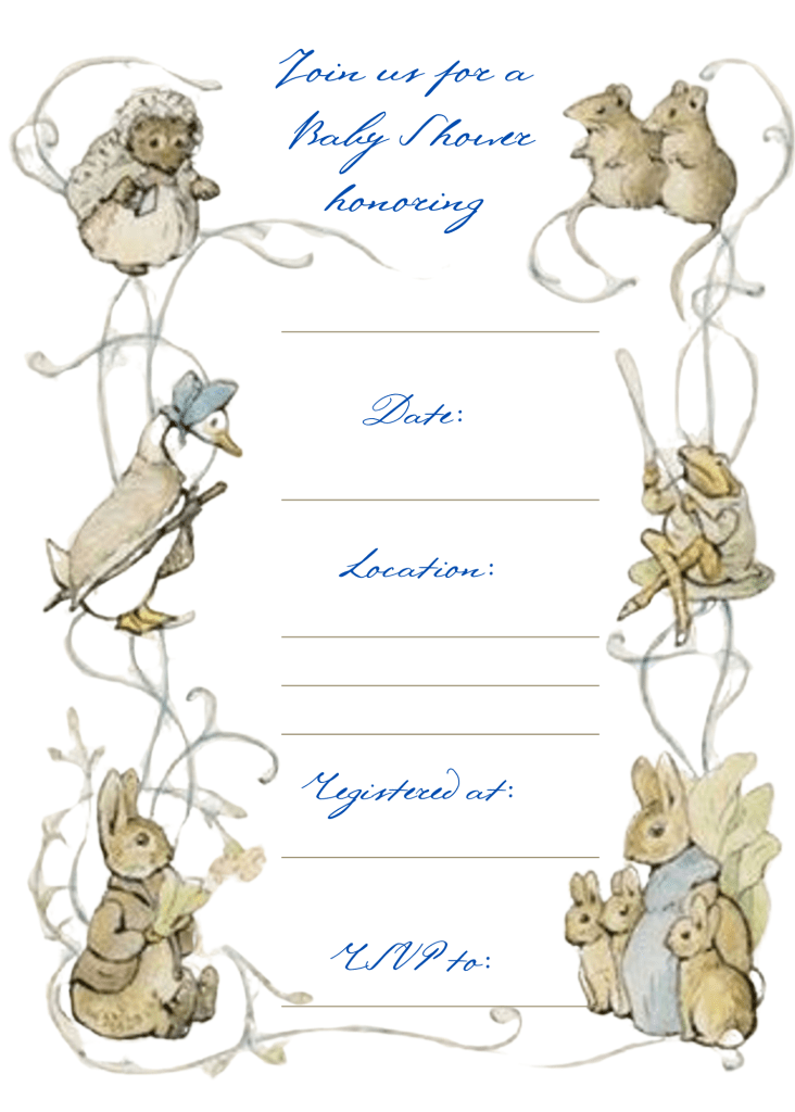 Just for you is a free printable Beatrix Potter invitation template made with a page from the beginning of the Tale of Benjamin Bunny. It shows some of my favorite characters beautifully hand-painted in a soft and gender neutral palette (just in case your baby’s gender will be a surprise as mine all were!) You can right click to save it and size it to your liking for printing. It is a write-in invitation which is a little old fashioned, or vintage you might say, but you can plan a special day with your friends to fill them in and get them ready to send out. More memories to cherish forever for your Baby Shower!