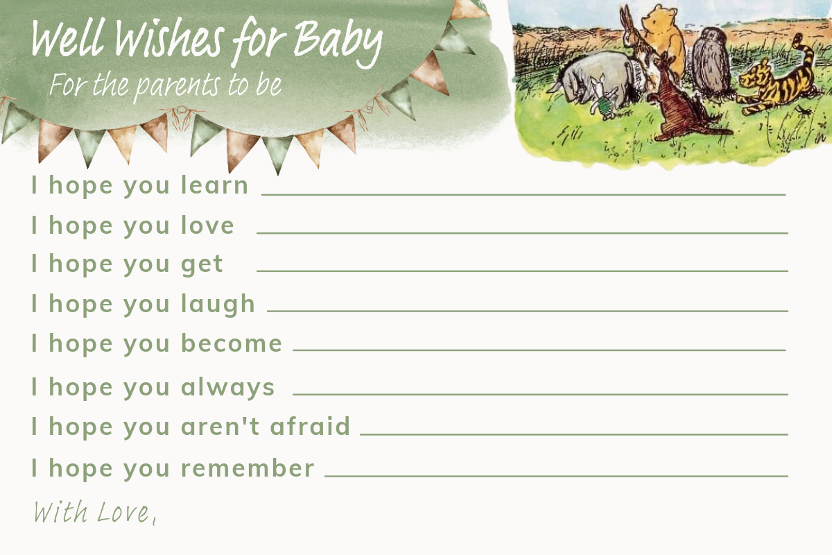 You’ve got enough on your plate getting ready for the baby, so here is some help with the shower! If you are hosting a baby shower for a friend or family member, this is for you. This free, printable Winnie the Pooh Well Wishes for Baby Advice Card gives you a fun activity for your guests and a wonderful keepsake for mom, dad, and baby.